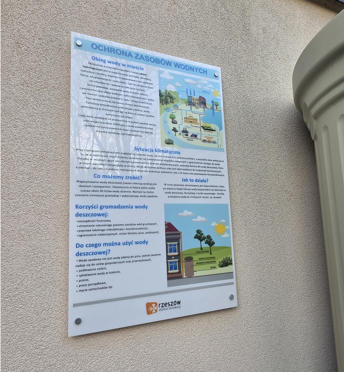 Ponadto, przy placówkach edukacyjnych, w których zbiorniki zostały zamontowane jeszcze w czerwcu, zostały wykonane tablice edukacyjne o ochronie zasobów wodnych. Działanie te związane są z realizacją „Programu edukacji ekologicznej w zakresie przeciwdziałania zmianom klimatu” obejmującego zakup i montaż zbiorników retencyjnych naziemnych na deszczówkę wraz z tablicami edukacyjnymi montowanymi przy jednostkach organizacyjnych Urzędu. Program swoim zakresem obejmuje część edukacyjną i praktyczną w formie prelekcji z wykorzystaniem zamontowanej tablicy edukacyjnej oraz zbiornika na wody opadowe.